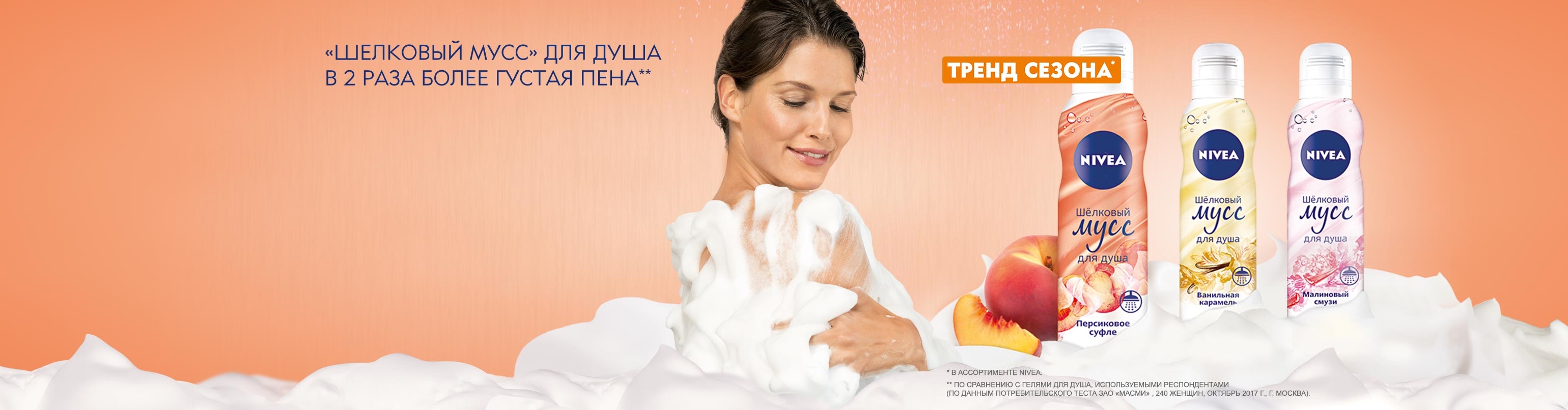 NIVEA разработала яркую линейку десертов для душа. Отличаются муссы исключительно парфюмерными композициями. При этом все муссы NIVEA содержат в составе секретный ингредиент: экстракт шелка. Формула продукта невероятно воздушная, а пена густая и нежная.