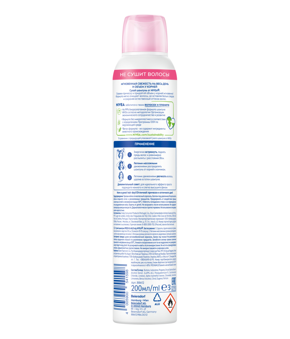 Сухой шампунь от NIVEA мгновенно освежит укладку и сохранит естественный оттенок ваших волос без белого налёта на волосах.