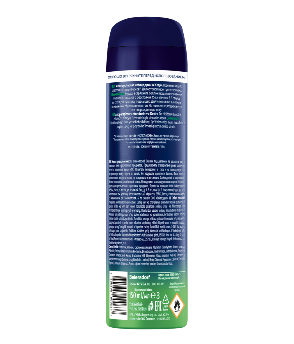 Антиперспирант NIVEA MEN Мандарин и Кедр обеспечивает защиту от пота и неприятного запаха на 48 часов и создан с формулой, которая активно борется с бактериями, вызывающими неприятный запах. Антиперспирант не содержит этилового спирта и дерматологически протестирован.