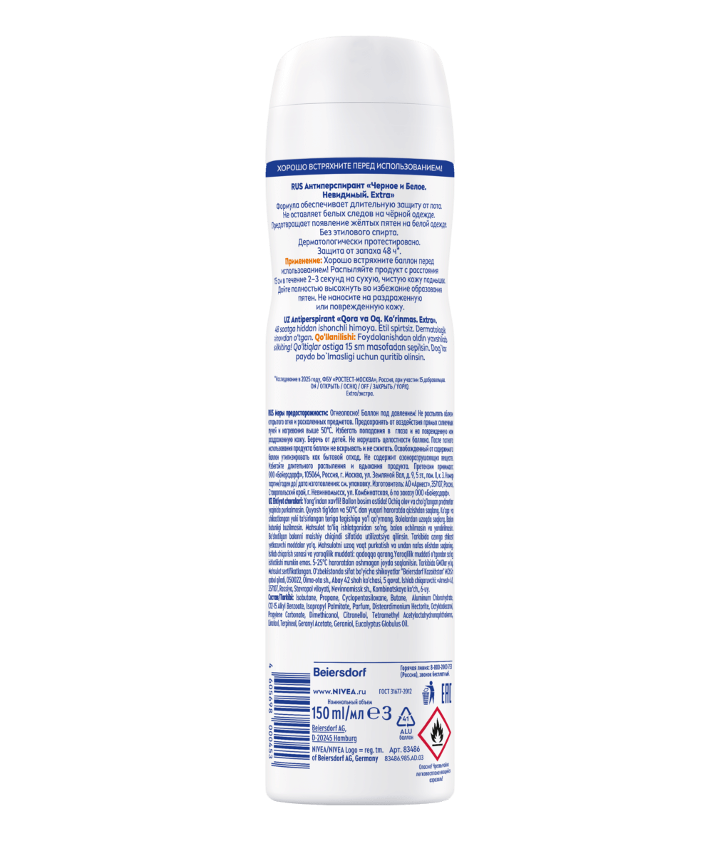 Антиперспирант Nivea Черное и Белое Невидимый Extra с улучшенной формулой и 5ю действиями защиты: от запаха, пота, пятен, следов и дискомфорта.