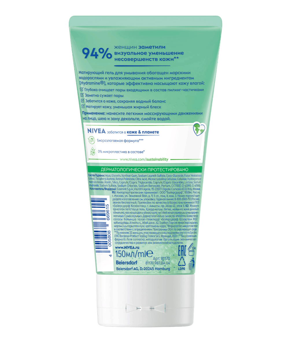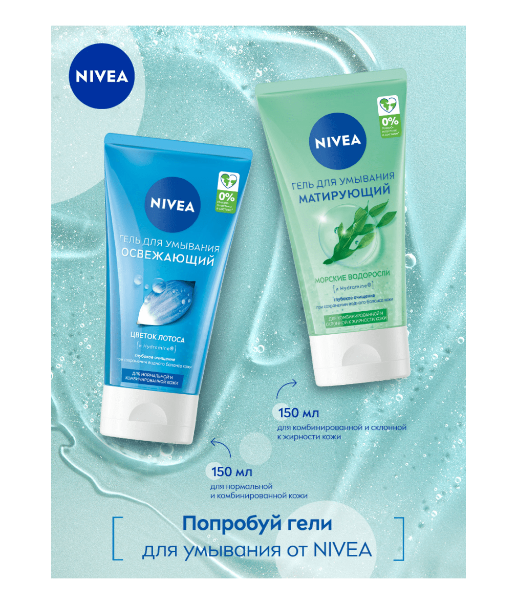 Попробуйте матирующий гель для умывания для комбинированной и склонной к жирности кожи от NIVEA. Матирующий гель для очищения лица обогащен морскими водорослями и увлажняющим активным ингредиентом Hydramine, которые эффективно насыщают кожу влагой.