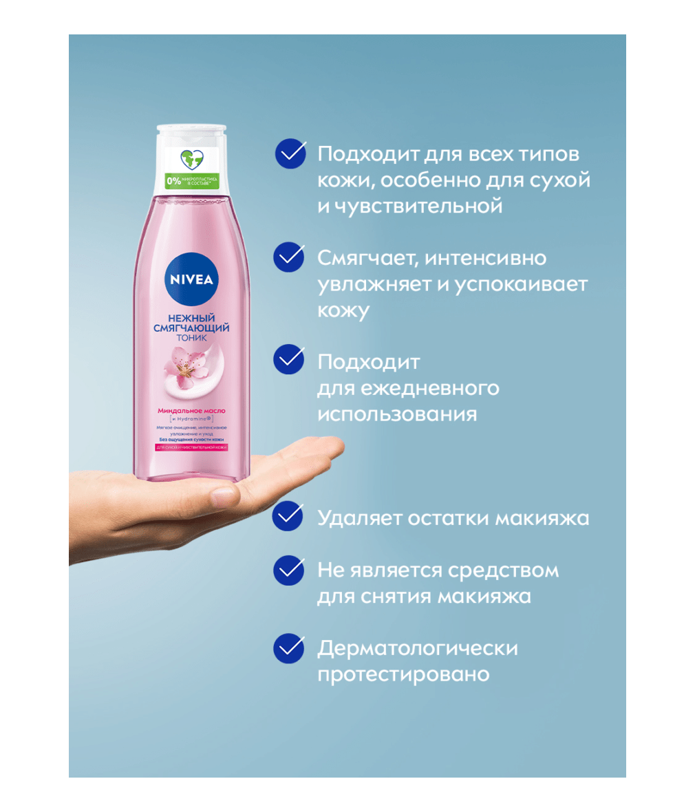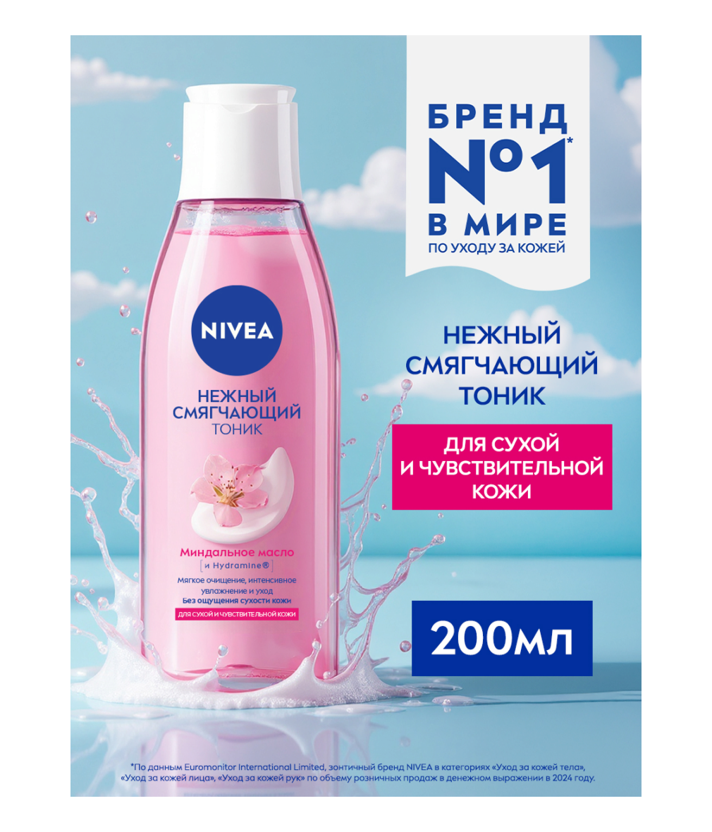 Нежный смягчающий тоник для лица для сухой и чувствительной кожи от NIVEA обогащен миндальным маслом и увлажняющим активным компонентом Hydramine, которые эффективно поддерживают естественную увлажненность кожи.