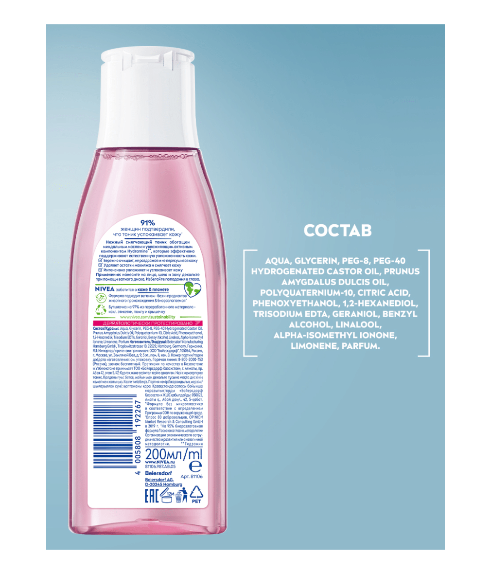 В составе: Aqua, Glycerin, PEG-8, PEG-40 Hydrogenated Castor Oil, Prunus Amygdalus Dulcis Oil, Polyquaternium-10, Citric Acid, Phenoxyethanol, 1,2-Hexanediol, Trisodium EDTA, Geraniol, Benzyl Alcohol, Linalool, Alpha-Isomethyl Ionone, Limonene, Parfum